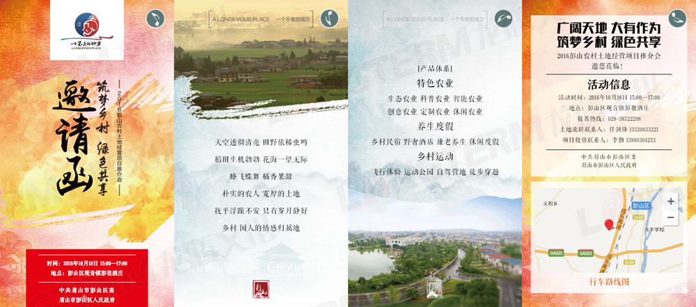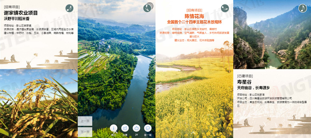 本項目包含彭山宣傳H5頁面設計制作、彭山精品土地推介H5頁面設計制作、彭山土地推介會邀請函H5頁面設計制作,通過簡約的設計和適量的CSS3動畫,制作出精美的手機分享專題網頁,可有效的傳播和推廣。